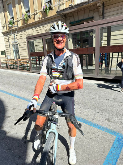 "Wir waren frühzeitig Vorort, in den Abruzzen und somit konnte ich den Gravel-Parcour, der mir schon als schwerste Gravel-Strecke der Welt beschriebenen wurde, verinnerlichen. Anfangs waren 2 x 5 m „caduta-libera“ (freier Fall) in der Strecke, eigentlich senkrecht, nach Protesten wurde dieser Teil entfernt, so war jedoch jeden Tag eine Änderung auf dem wohl nicht vorhandenen Plan☹️, Start und Zielgelände wurde verlegt und wieder zurück geändert, selbst am Renntag-Morgen wusste noch keiner wo die Startaufstellung sein wird. Die Krönung ist natürlich, dass es bei so einer Veranstaltung keine sanitären Anlagen gab, weder WC noch Duschen noch Radwaschplatz.